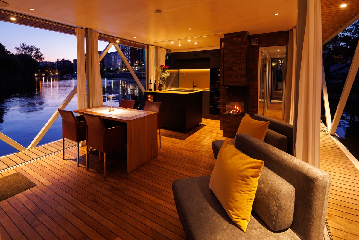 Mabelle Joyeuse: tu refugio en el centro de Berlín. La casa flotante Mabelle Joyeuse, de 160 m², es un elegante apartamento con sauna y chimenea en el río Spree, tranquilo, céntrico y perfecto para quienes desean combinar el ambiente urbano y la relajación. Descubre Berlín directamente desde el agua. Ya sea una escapada romántica, una estancia de trabajo inspiradora o un pequeño viaje de descubrimiento por la capital, puedes esperar privacidad, estilo y la sensación única de libertad justo en el paseo marítimo.