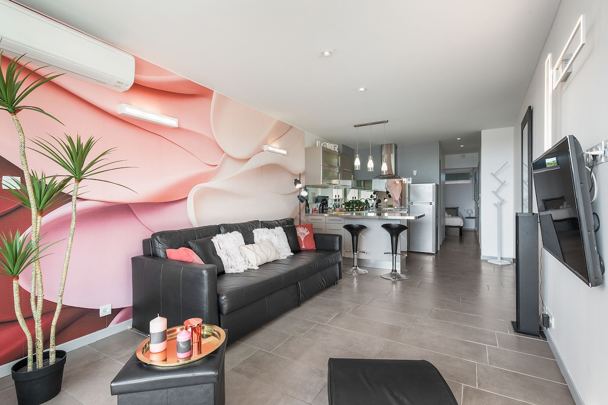 La Tour Rosée, un tinyhouse insolite de 22m2 , climatisé et rénové avec gout au sein d'une propriété de 1000 m2 avec une maison composée de 2 appartements à coté. Un toit terrasse pour les apéros Piscine (partagée) , ouvert mi mai a fin aout coin " chill" avec transats et table de ping-pong pour les sportifs! Lit de qualité - 160 x 200 Cuisine équipée, coin repas douche, WC Plancha et terrasse privative