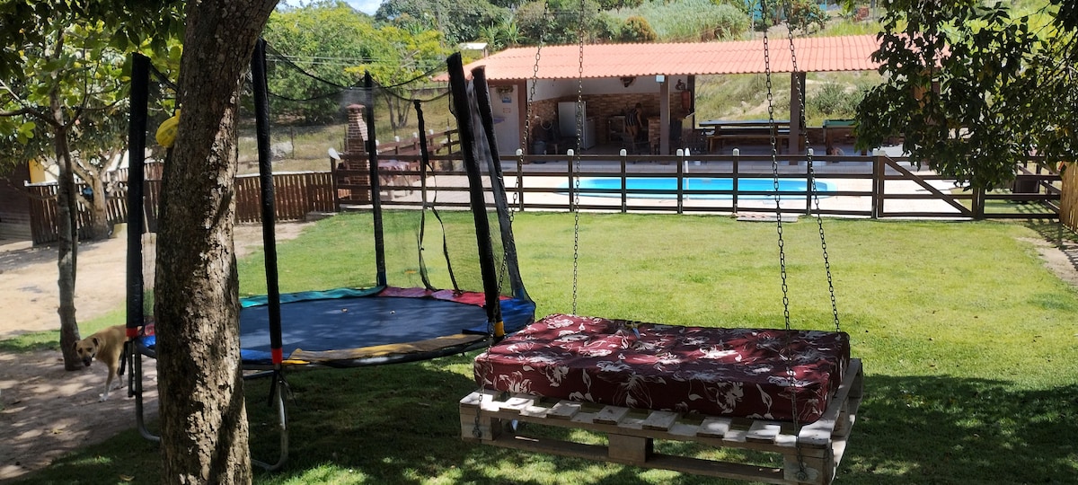 Nuestro alojamiento tiene 2 dormitorios, ambos con ventiladores de techo y aire acondicionado, 1 suite, 2 baños, ambos con agua caliente. Tiene una vista increíble, muy cerca de toda la zona de ocio que se ofrece. Muy acogedor y espacioso. El lugar tiene toda la estructura de un hotel agrícola, piscina climatizada, parque infantil, paseo a caballo, etc. Tenemos una pantalla de protección contra mosquitos en todo el departamento.
