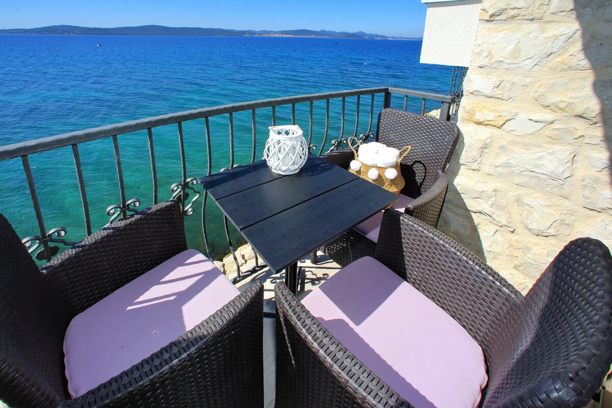 Apartamento de lujo frente a la playa en el piso 2 de la villa de nueva construcción ubicada directamente en la hermosa playa en Sukošan. Este moderno apartamento está equipado para un máximo de 4 personas. El amplio balcón cubierto de madera ofrece una vista increíble al mar. Es una puerta perfecta para tus vacaciones románticas en la playa. Disfruta de la cálida noche de verano descansando en tumbonas, viendo estrellas brillantes y escuchando el sonido de las olas del mar debajo de ti.
