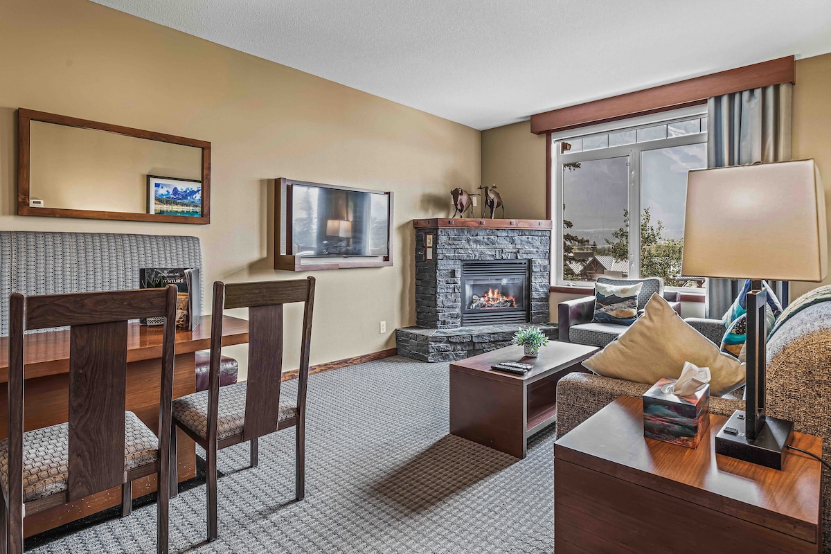 Top floor 1 bedroom suite offering stunning views of Lady Mac & Grotto Mountain from a private balcony: - 15 min walk to downtown Canmore - 15 min drive to Banff - Free High-speed Wi-Fi & Cable - Free Banff Park Pass - Heated Underground parking with EV chargers - Master bedroom with King Bed, walkout to balcony - Living Room with fireplace, TV & a plush couch that can easily be pulled out into a queen bed - Full access to Resort shared amenities like heated pool, 2 hot tubs & BBQ/Patio area