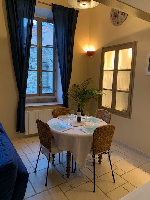 Si su coraje le permite subir los 42 escalones de una escalera poco gloriosa, tendrá la oportunidad de encontrar un pequeño nido acogedor situado bajo los tejados. A continuación, podrá descubrir esta vista impresionante del barrio medieval y su iglesia de San Cerneuf y, después de ignorar las antenas de televisión en los tejados y el ruido de la moto que pasa a lo lejos, su imaginación podría perderse en otra época.