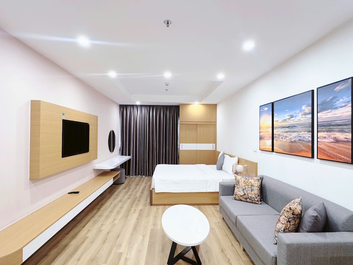 "căn hộ studio với 2 giường ngủ được thiết kế hiện đại trẻ trung, phù hợp với mọi đối tượng khách hàng.Từ ban công bạn có thề ngồi thư giãn và ngắm nhìn toàn cảnh thành phố .Phòng có đầy đủ tiện nghi , wifi tốc độ cao, có không gian bếp , khu sinh hoạt chung, cùng trang thiết bị hiện đại.Căn hộ cách biển chỉ vài bước chân, quý khách không phải lo chuyện giặt giũ bởi vì ngoài ban cộng được trang bị máy giặt cùng chổ phơi đồ rất tiện lợi. Việc di chuyển đến các điễm ăn uống vui chơi cũng rất gần"