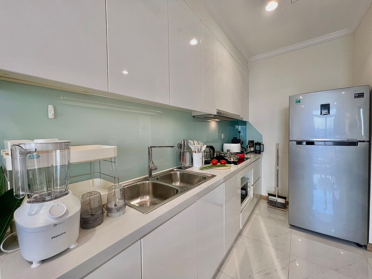 Diseño moderno, amenidades, gran balcón con vistas a la ciudad Hay 2 dormitorios, 1 cama tamaño king y 1 cama tamaño queen, 2 baños, sala de reuniones. Gratis para lavadora, secadora, wifi, TV por cable, estufa, horno, área de barbacoa Servicios públicos internos y cercanos: piscina, gimnasio, estación de parrilla, estacionamiento, centro comercial Vincom Megal, supermercado Vinmart, parque, restaurante, Mega Market, cine,... cerca de la zona de bar, punto de referencia de 81 pisos. Seguridad las 24 horas, 24 horas. El departamento está en el distrito 2, en todas partes hay cerca cuando te quedas aquí.