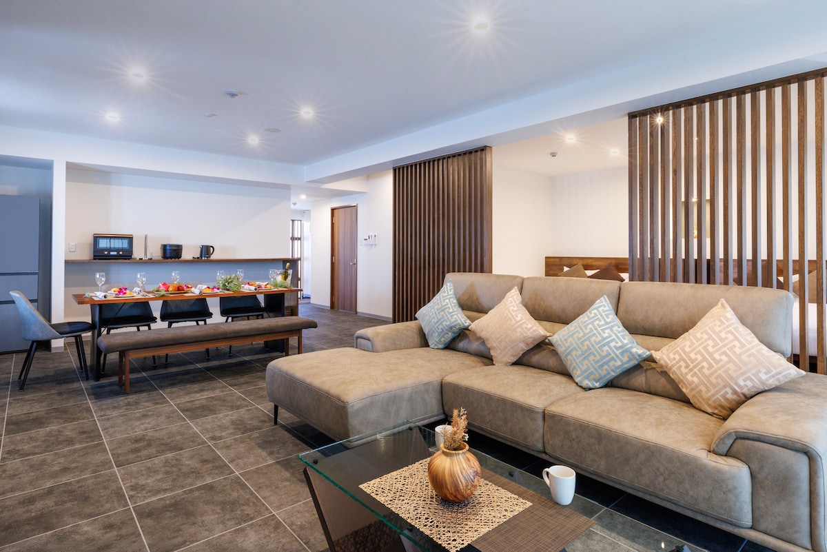 リバーサイドテラス・オキナワ・カデナ3F 「ZEN - 禅 -」のコンセプトは『和モダン』です! 木を贅沢に使ったインテリアで、和の雰囲気を大切にした心落ち着くお部屋です。 ジャパニーズ・モダンスタイルのくつろげる空間で、リラックスした和みの時間をお過ごしいただけます。 お部屋の随所には、日本人が昔から愛した漆を塗りこんだ特別な壁紙を貼り、高級感あふれる空間になっております。 室内にいながらも空の広さも感じられ、雄大な比謝川の流れ、木々の緑、空の青さを満喫しながら特別な時間をお過ごし下さい。 *Wi-Fiあり *無料駐車場1台(2台目は他のゲストの車が停まっていない場合は駐車可能) *3歳以下無料