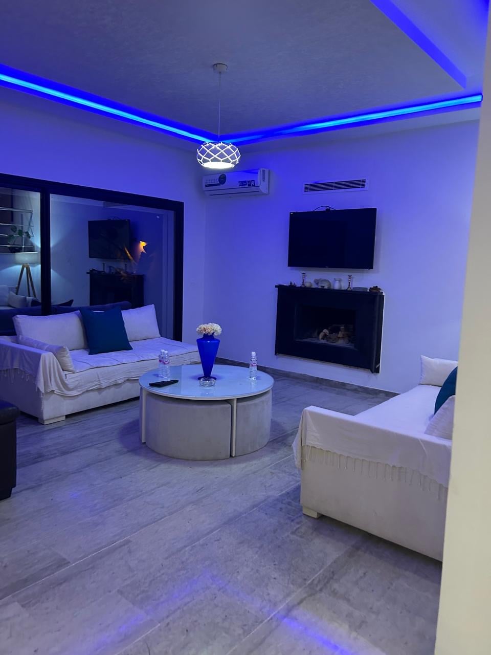 Nuestra villa está ubicada a 3 minutos en auto del teatro Hammamet. La entrada tiene piscina privada, garaje grande y amplio jardín. La harina molida tiene un cómodo salón equipado con TV, aire acondicionado, encantadora chimenea de mármol negro y cómodos sofás junto con una puerta de ventana que se abre a la piscina. También tiene una cocina moderna y bien equipada, comedor, un baño y una habitación de invitados adicional equipada con un vestidor. El primer piso tiene 3 suites principales, todas equipadas con aire acondicionado, balcones y baños privados.