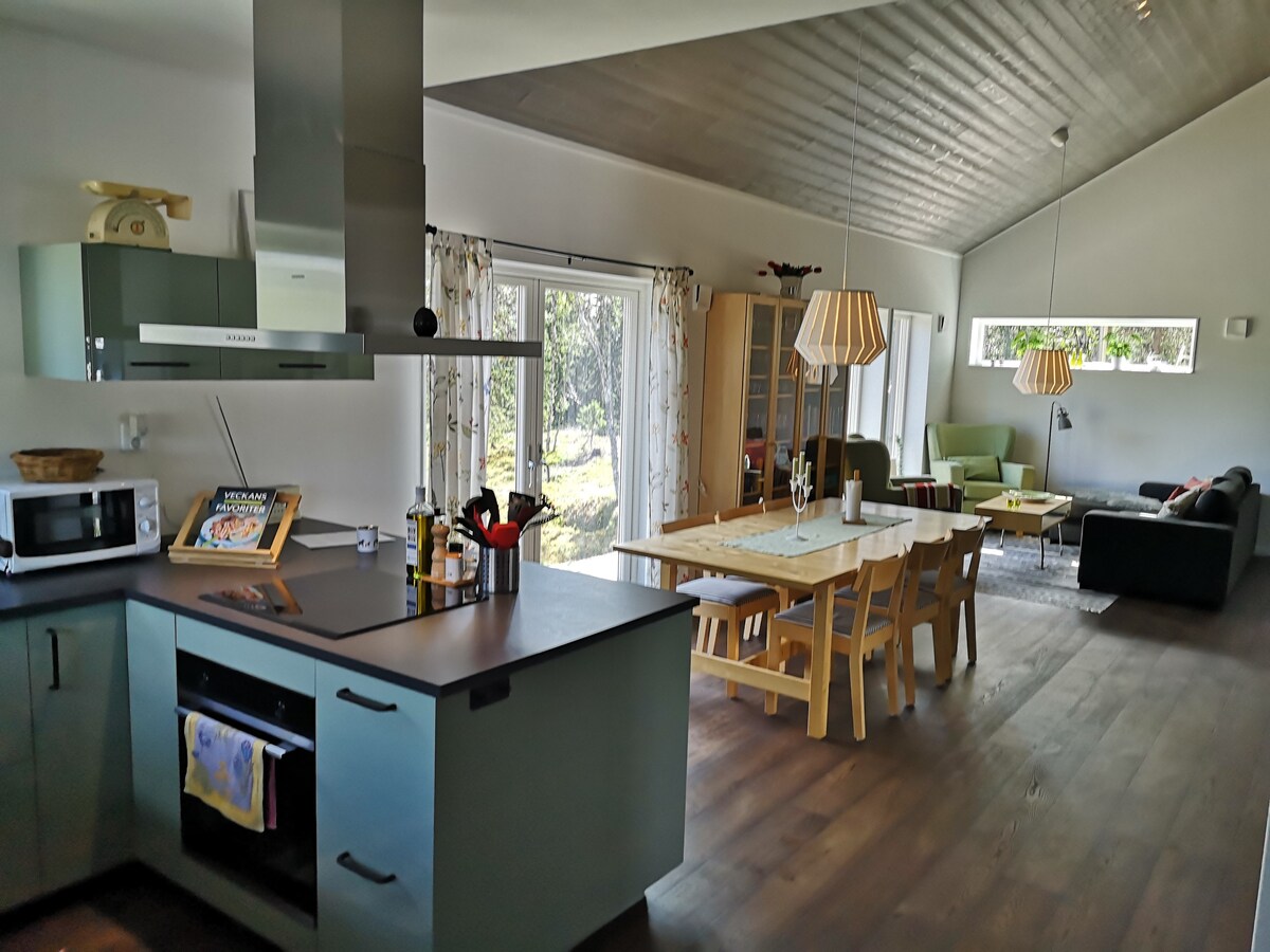Los grandes ventanales dejan entrar la naturaleza y la luz. Una acogedora mezcla de madera clara, detalles vintage personalizados y toques orientales. Vives cerca de vastas zonas silvestres en Grövelsjön y Foskros, tres estaciones de esquí y pesca con mosca en Storån, así como el vecino Idre Golf. Tienes un bonito bosque detrás de la colina con arándanos y setas, un sendero peatonal arado de 3,5 km y un chapuzón frío en el río a diez minutos a pie. Además de carriles bici. Esperamos que te encante nuestra casa y la naturaleza que ofrecen Idre y los alrededores.