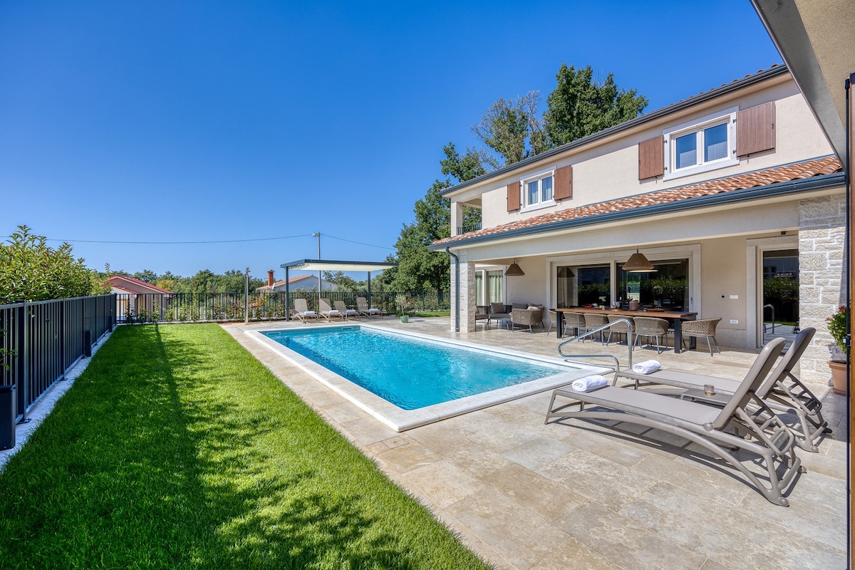 Stylish villa near Rovinj with picture worthy pool, sunk in hot tub, sauna. Wake up to lush, panoramic valley views. Couples and family-friendly, a short drive to adventure park, Brijuni National Park, dinopark, medieval towns & local cuisine. It is a true green escape for anyone looking to get back to nature with all the comfort of modern living. Fully equipped for cooking and entertainment in 2600 m2 of garden (football, speed ball, badminton & pool fun) for your kids and loved ones to enjoy.