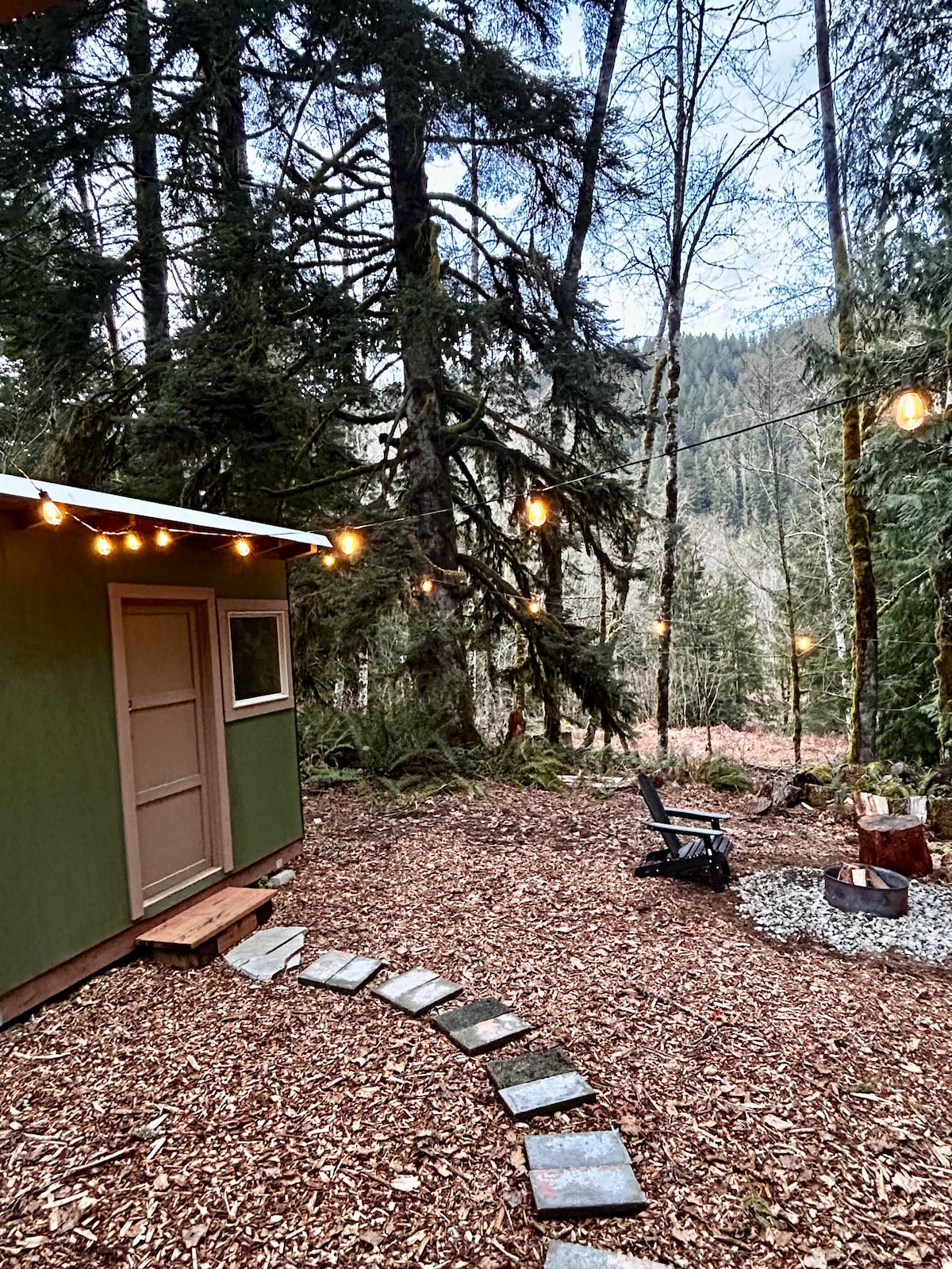 This cozy riverfront tiny cottage in Index is nestled in the evergreens and overlooks an amazing view of the Skykomish River. The cabin is a mixture of rustic and refined and will be enjoyed by those who want the experience of being in nature while keeping some of the comforts of home. The cabin has full wifi. There is no TV at the cabin but all your streaming options are available via your devices. There is hot running water in the cabin with an RV style toilet and shower.
