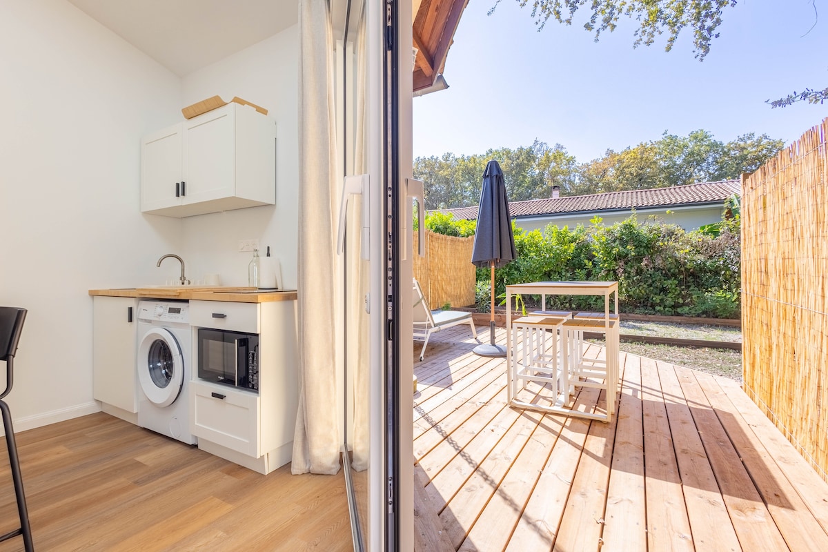 Studio avec chambre (lit double 140x190), séjour cuisine avec canapé, salle de bain-WC et terrasse. Accolé à une maison, le studio bénéficie d'une entrée indépendante et d'une place de parking.. Quartier résidentiel très calme.. 10 minutes en voiture de Bordeaux Lac (stade Matmut et parc des expositions). 2kms à pied de la gare Tram (ligne C) . 45 minutes en voiture de l'océan.