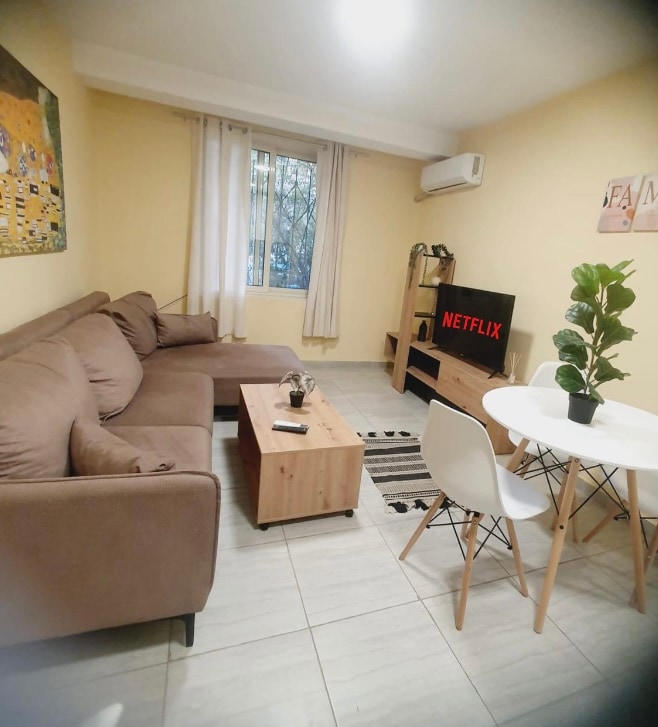 MELA's apartment offers you a great experience for up to 3 persons. It has a double room with a matrimonial bed and a living area with a sofa bed. It is situated in the forth floor of a building facing Sami Frasheri street and next to Wilson Square. It has no elevator so keep in mind if you have huge luggage and are staying for a short period, but the stairs are really smooth to climb and with natural light.The apartment is totally renovated in a stylish and cozy styly
