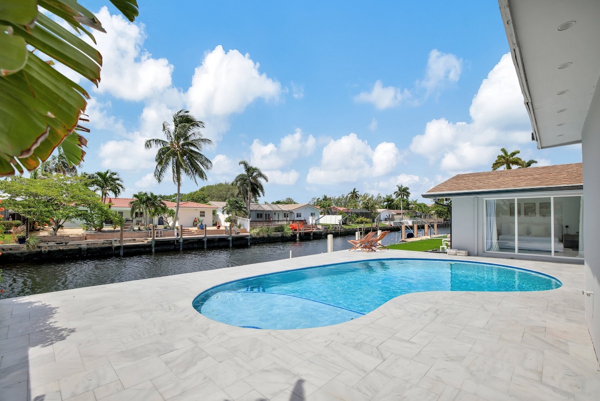 Esta es una hermosa casa de 1840 pies cuadrados actualizada. El exterior es una zona acogedora con piscina, muelle de 60 pies de acceso directo al mar, un maravilloso comedor a la sombra, barbacoa, bicicletas, kayak, paddleboard y juguetes/sillas de playa/piscina. El cómodo interior incluye comodidades como 2 televisores grandes, excelente wifi, café, cocina, baño y artículos de tocador. Ubicación privilegiada cerca de todo lo que las zonas de Pompano, Fort Lauderdale/Las Olas ofrecen de playas, muelles, pesca, golf, tiendas y restaurantes.