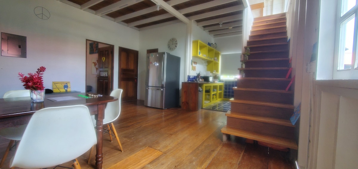 Estamos ubicada en un istmo, con una bahía al frente y atras una playa de 3 km. Centro a 1 km. Cerca tiene parque "Bocas Del Toro" y un skatepark. Supermercado a 100 metros y gasolinera a 200 metros. Primera planta: salón, cocina, baño y dos camas individuales o una cama King uniendolas. Segundo piso de habitación tipo loft de 60m² con cama Queen con vista al archipiélago y ventana que se abre a lo largo de toda la casa. Terraza sobre el mar de 9mx5m con mesa para relajarse, bbq y hamaca.