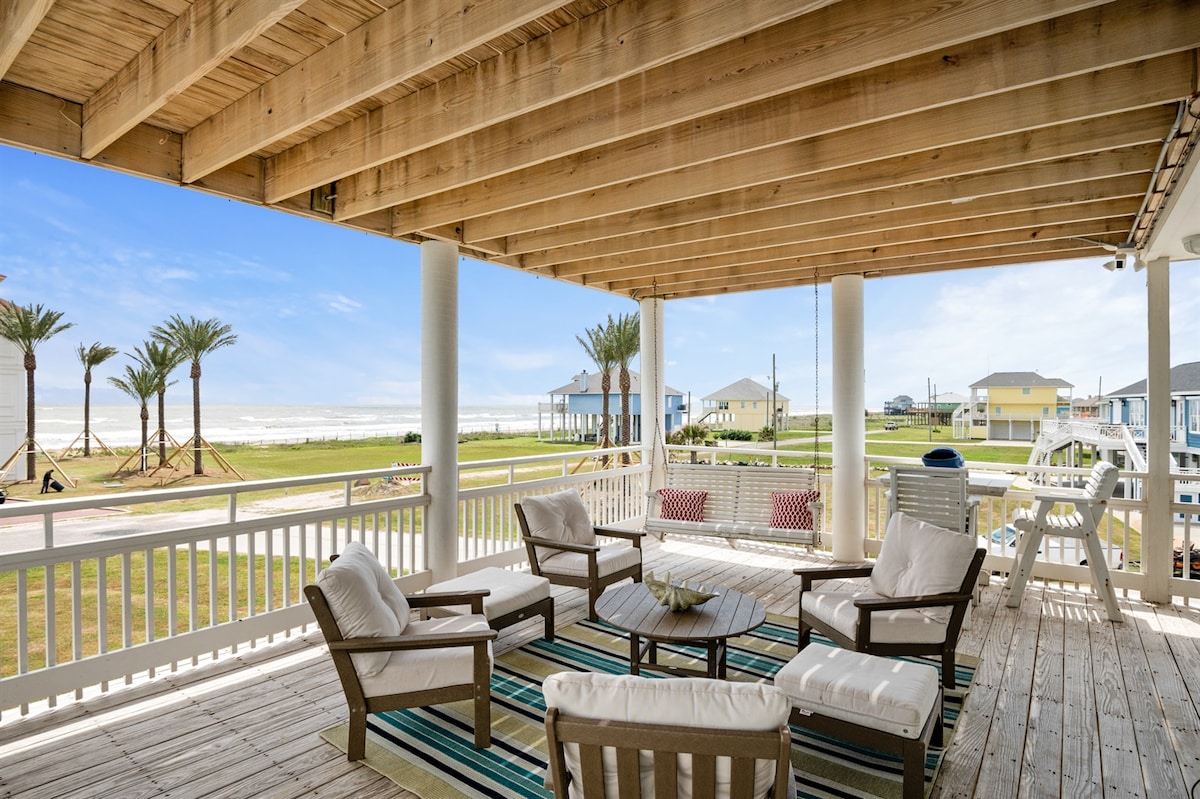 ¡Vistas al mar sin obstáculos! Se ve hasta la playa de Galveston. Cuatro dormitorios y 3 baños y un aseo. Mucho espacio y varias cubiertas para disfrutar del sol. Tienes espacio para entretenerte dentro de la casa de playa, pero también debajo, donde encontrarás un gran bar incorporado, barbacoa de propano/carbón, columpios, hamaca y ducha exterior. Patio vallado. Paso privado a la playa. Cocina gourmet con despensa. Televisores en todas las habitaciones. ¡El dormitorio principal tiene bañera de inmersión con vistas a la playa! Capacidad para 14 personas.