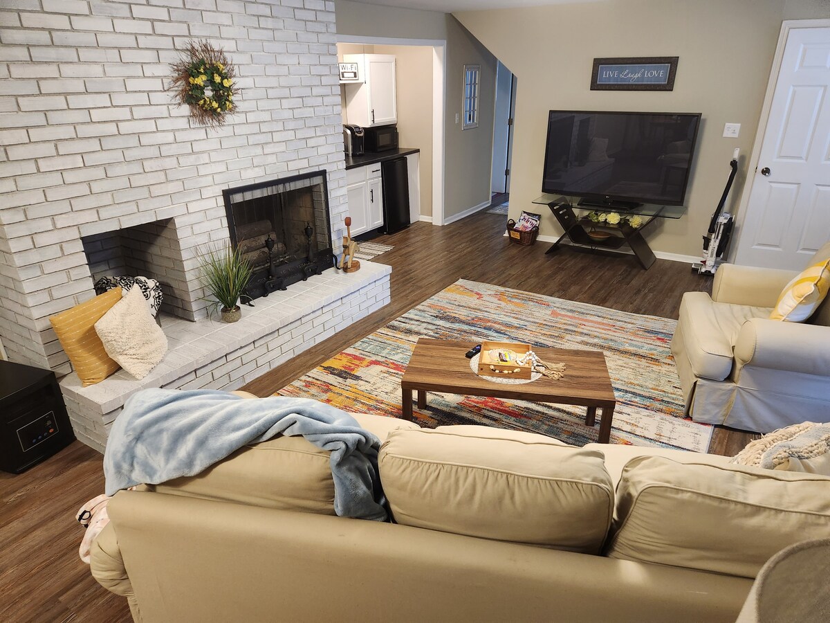 Todo el nivel inferior de la casa con 2 hermosos dormitorios grandes, ¡baño espacioso con mucha agua caliente en la ducha! Hermosa chimenea en una preciosa sala de estar con comedor. La cocina pequeña incluye nevera, horno tostador, microondas y cafetera Keurig. ¡Este apartamento de nivel inferior es luminoso y espacioso, con grandes ventanales en cada habitación! Los dormitorios incluyen televisores junto con un televisor de pantalla grande en la sala de estar. ¡Zona de estar privada al aire libre con chimenea para disfrutar de tus noches!