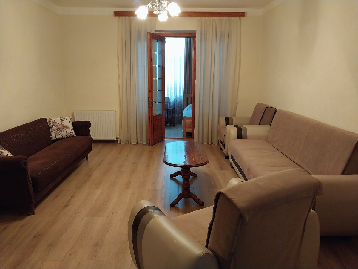 Newly refurbished luxury apartment in heart of Borjomi. Luxury bathroom with Grohe Rainshower. Two bedrooms with two comfortable beds in each bedroom. Fully fitted kitchen with kettle, toaster, hob, fridge, freezer and washing machine. Sitting room with one sofa bed and one folding bed. Beautiful view of mountains. Outside: covered terrace and well maintained gardens. Very close from Museum, supermarkets, train and bus stations and famous Borjomi park.