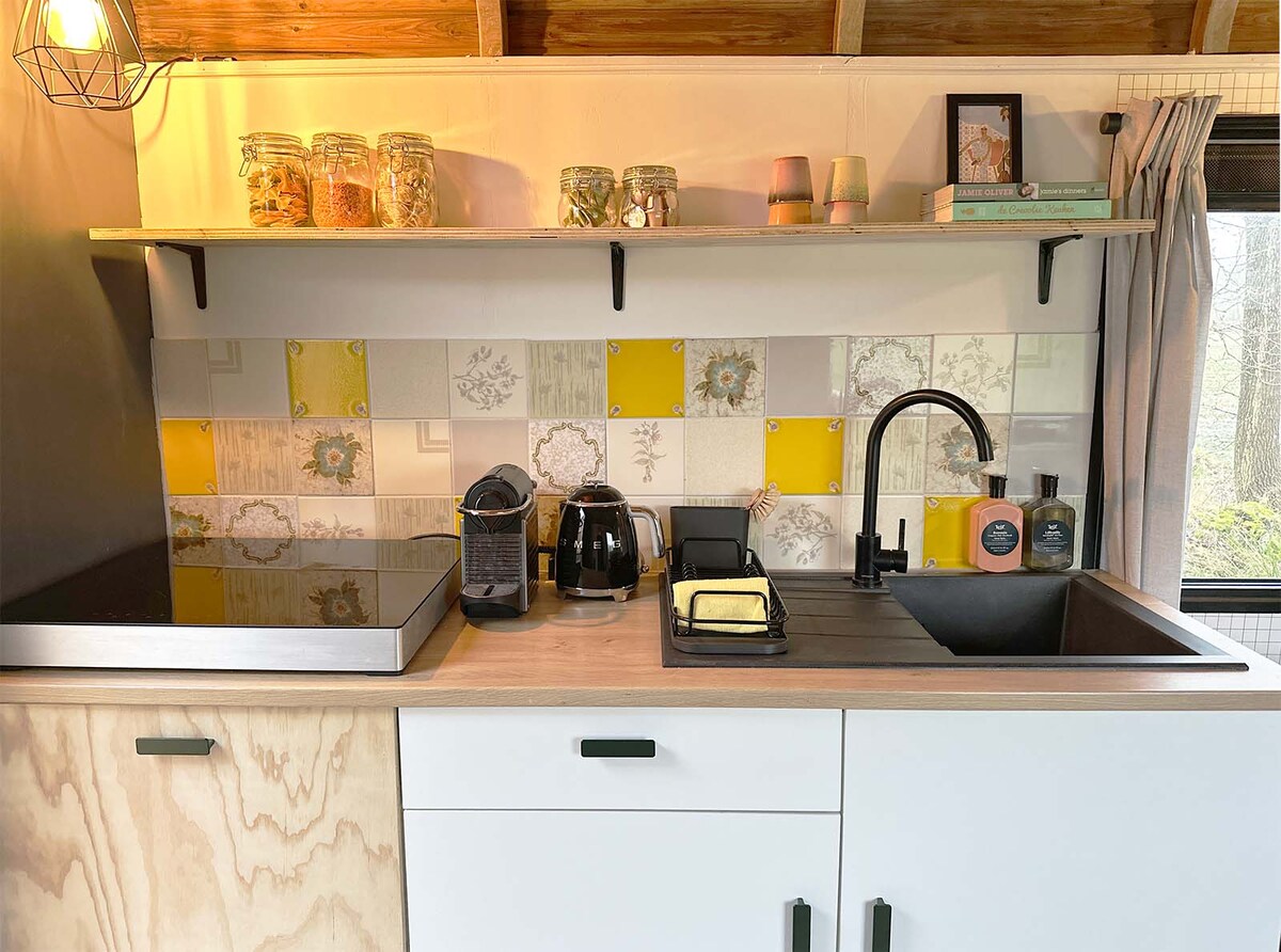 ¡Duerme al aire libre con un toque de comodidad! Aquí encontrarás un vagón gitano lujosamente amueblado con sus propias instalaciones sanitarias al aire libre. El vagón gitano tiene una buena cama doble, una cafetera, una bonita tetera SMEG, nevera, iluminación y un ambiente agradable y lujoso. El vagón gitano se encuentra en una gran terraza y tiene vistas al paisaje pintoresco. Con una taza de café fresco y las aves de fondo, puedes disfrutar de la tranquilidad y la naturaleza.