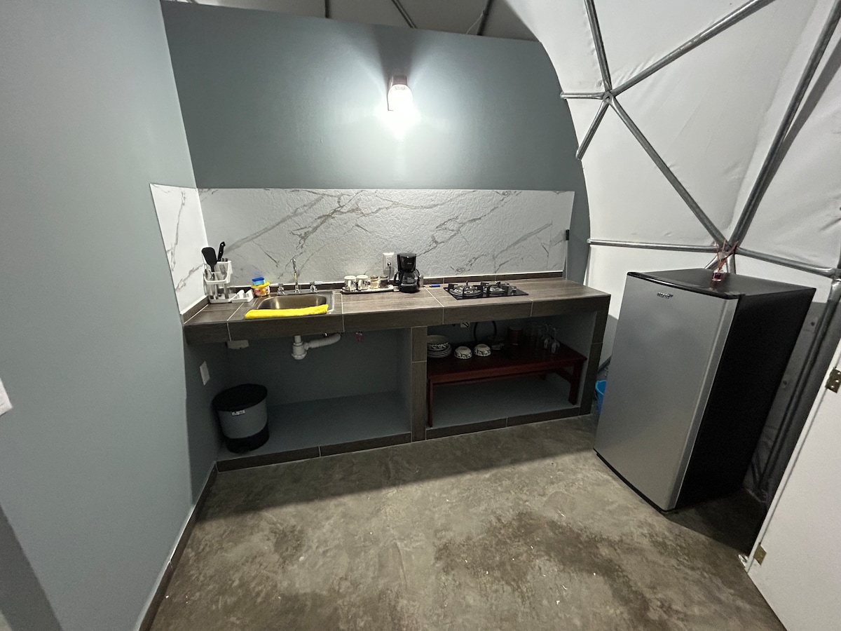 We have 3 more https://abnb.me/dobQuKhzUHb https://abnb.me/J2QI6zIzUHb https://abnb.me/4CukDRDzUHb This dome is a shell structure built from metal rods in this case, that allow the dome to withstand very heavy loads and high winds despite its lightweight structure. Most of the time when you think of glamping being off-grid comes with it. While you're not exactly off-grid here, as you do have electricity and wifi but you are off the beaten path enough to catch the sunset&sunrise from your dome.