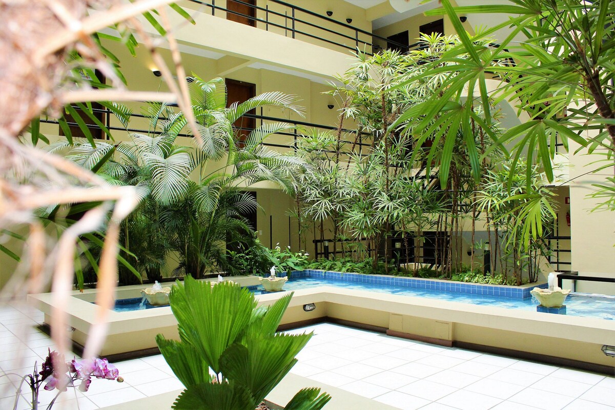 Combinamos estilo, comodidad y funcionalidad en este espacioso estudio con un balcón frente al Bosque do Papa. El aire caliente y frío potente y silencioso, cama tamaño queen, wifi rápido, TV inteligente de 65 pulgadas, sofá cama súper cómodo, cocina completa, baño con ducha, son solo algunas de las atracciones de este espacio. Ubicado en una calle tranquila, estamos a pocos pasos de excelentes restaurantes, supermercados, farmacias y el autobús turístico en tu puerta. El check-in sin contacto hace que la llegada sea fácil y cómoda.
