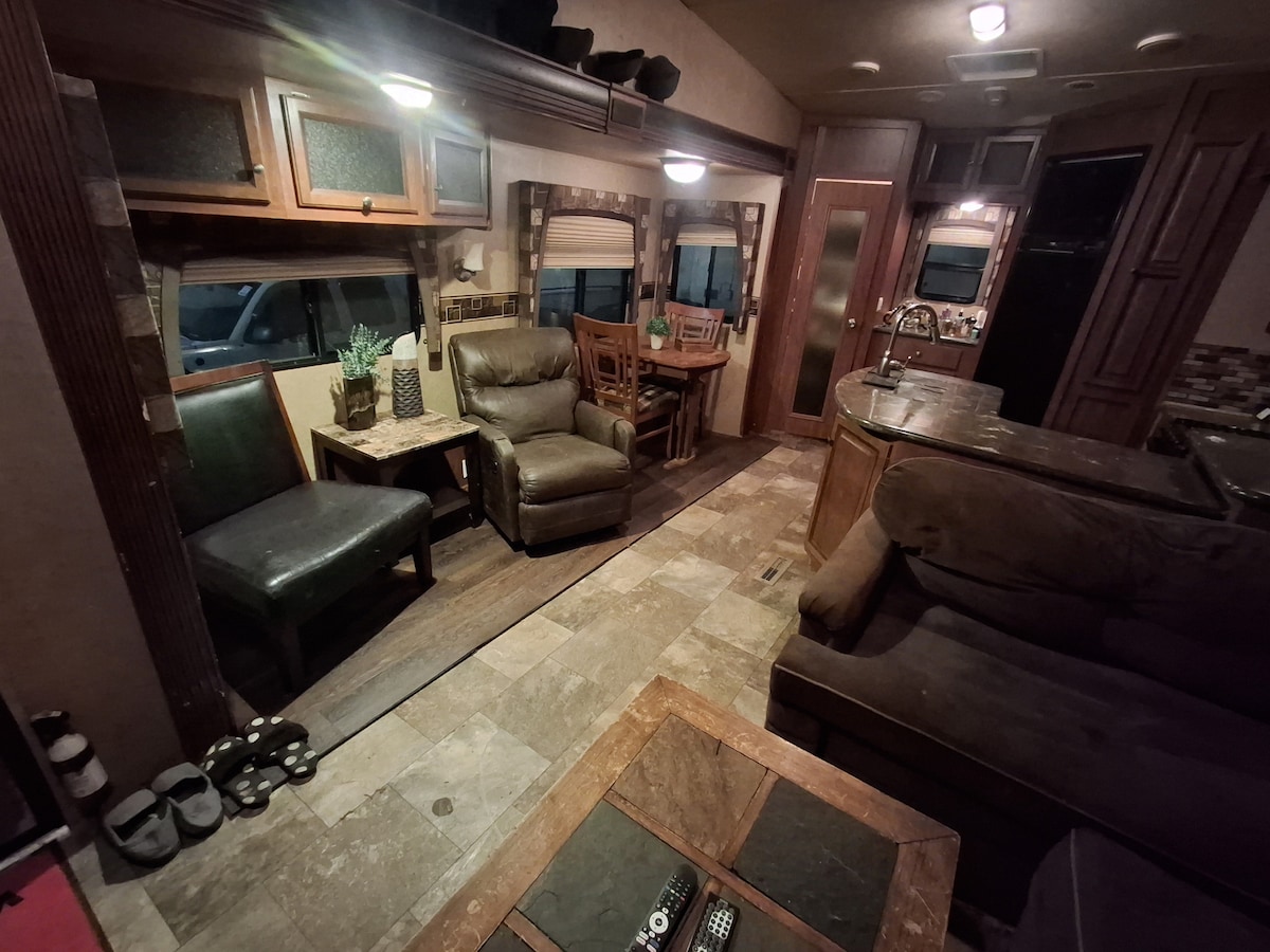 Entra en un acogedor refugio de cabaña de inspiración bohemia con un encanto vibrante y texturas terrosas. Perfecto para 2 personas, con una cama tamaño queen, aire acondicionado, chimenea, nevera, TV, sábanas y toallas. Acceso privado al baño/ducha a través de una tarjeta de escaneo. Disfruta del acceso a nuestra exclusiva área de bienestar: sumérgete en una bañera de hidromasaje de leña de estilo hillbilly (compartida con una cabaña), relájate en la sauna de leña compartida o refréscate en la inmersión fría. Lavandería de monedas en el sitio disponible en Prairie Junction RV Resort en Stettler, AB.