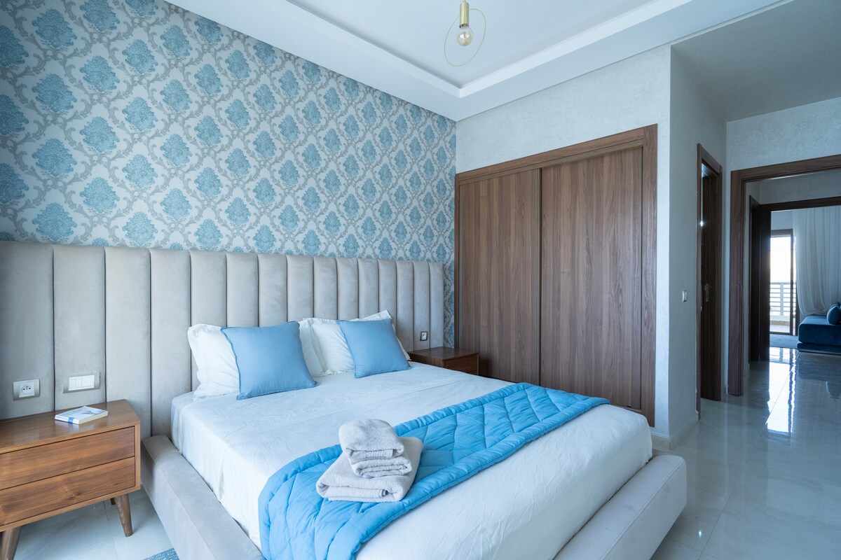 Séjournez dans ce magnifique appartement moderne et lumineux, avec vue sur l'océan, situé au cœur de la prestigieuse résidence BAHÏA GOLF BEACH à Bouznika. Ce logement sécurisé 24H/24 offre un cadre élégant confortable et parfaitement équipé pour vos séjours professionnels ou touristiques. Profitez d'un appartement climatisé soigneusement aménagé, doté d'une connexion fibre optique, netflix , d'une magnifique piscine et d'un parking privé pour un séjour en toute sérénité.