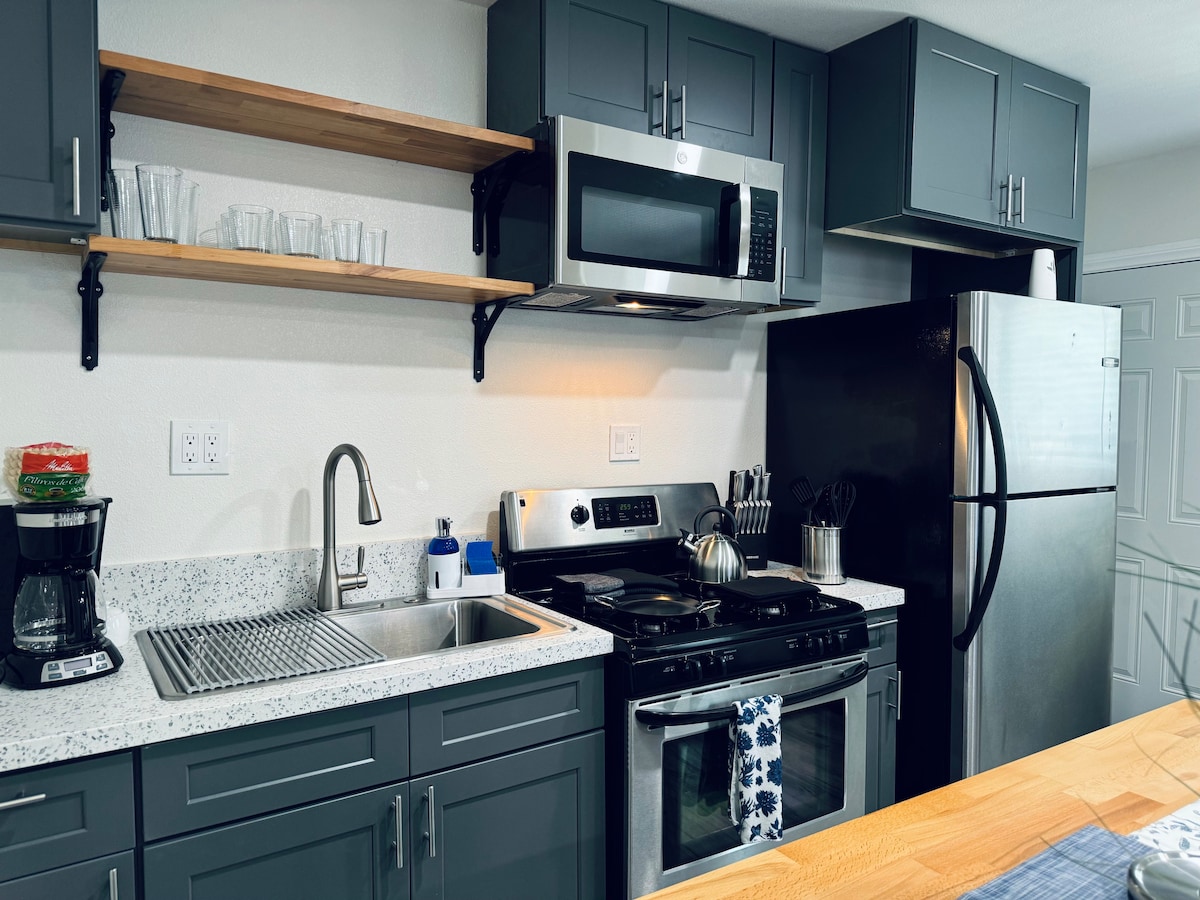 Aproximadamente 650 pies cuadrados. Estudio. Cama king cómoda. Capacidad para 2 personas cómodamente, opcional para un 3er huésped a tu discreción. Amplio espacio en el armario. Smart TV para que puedas iniciar sesión en tus aplicaciones de televisión favoritas. Sofá, mesa de centro y cómoda en el dormitorio/sala de estar de concepto abierto. Cocina completa. Wifi rápido. Lavadora/secadora (detergente) gratuita en la unidad. Refrigerador con máquina de hielo. Olla caliente de hervidor de vidrio (café instantáneo). Completamente desinfectado y limpio. Este no es un lugar compartido. Disfruta