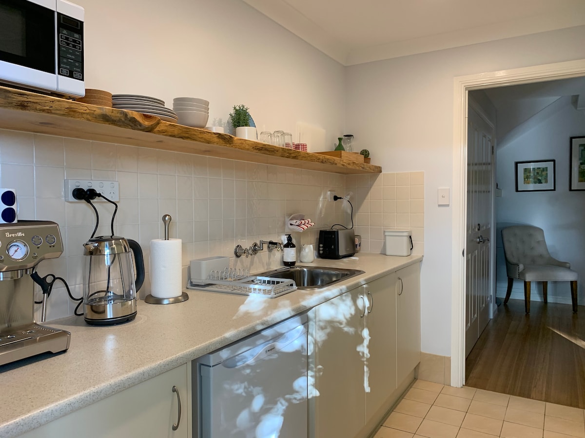 Esta suite de invitados privada, recién renovada y luminosa, se encuentra en una zona tranquila, a poca distancia a pie de la piscina, cafés, el centro de la ciudad de Bowral y la estación de tren. Si el Cherry Tree Walk y los paseos por el monte Gibraltar son atractivos, esto es para ti. Tendrás acceso independiente a una cómoda sala de estar. Hay una chimenea de gas. La cocina pequeña tiene una nevera de bar, microondas, cafetera y tetera. Tienes un patio privado junto al dormitorio, que tiene un ventilador y aire acondicionado.