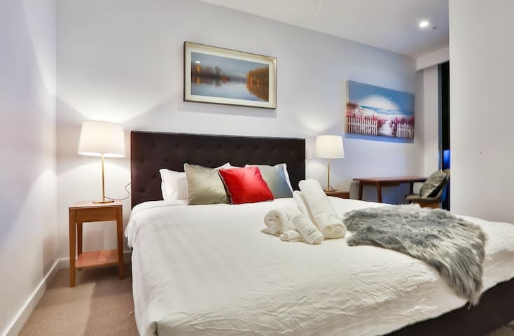 Inmaculada casa de un dormitorio directamente debajo del ático en la lujosa torre Whitehorse, el punto de referencia más alto fuera del distrito financiero de Melbourne. Adecuado para viajeros, negocios y parejas. Situado en el nivel 34, debajo del ático, con unas espectaculares vistas diurnas y nocturnas del horizonte de la ciudad de Melbourne, así como de la costa de la bahía de Port Phillip y de las montañas Dandenong. Esta posición única destaca entre las multitudes de Airbnb en la misma torre.