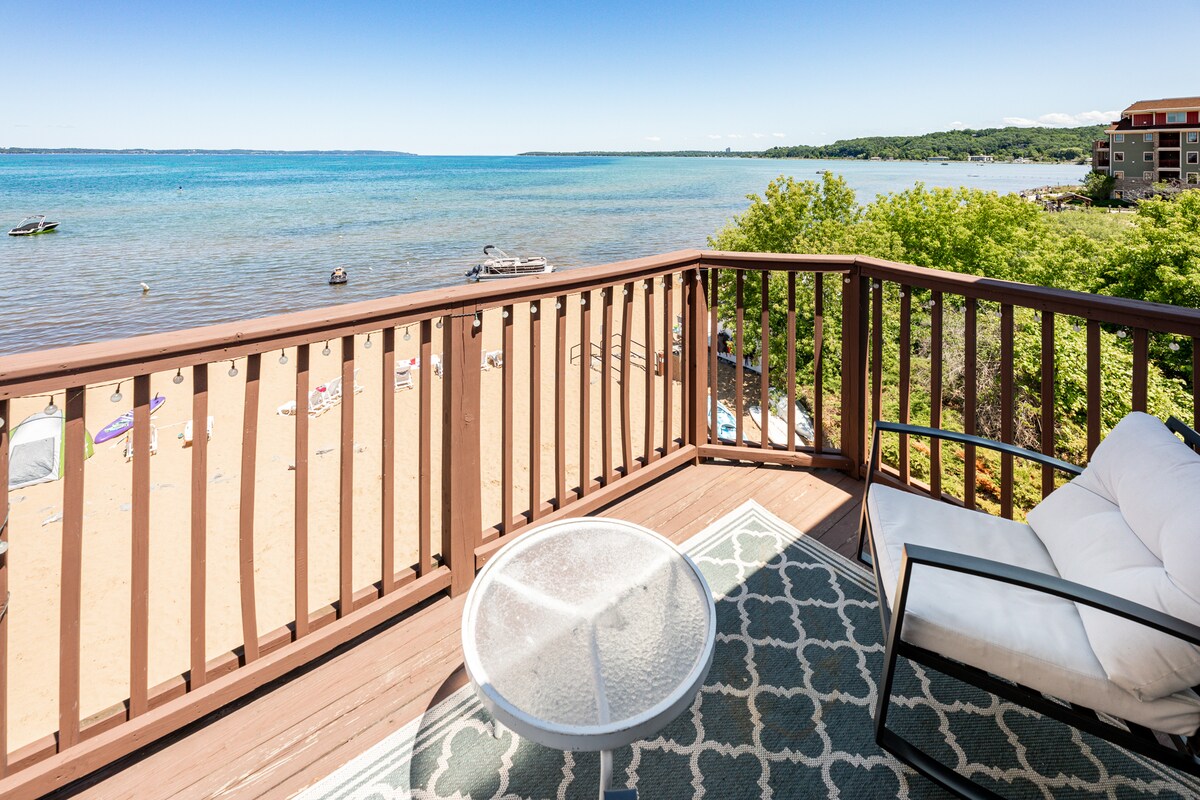 ¡Este hermoso condominio remodelado frente a la playa está en el segundo piso y se encuentra directamente en la resplandeciente bahía East Grand Traverse! Tu patio privado ofrece una vista privilegiada de la bahía y la playa de arena a continuación. La luz natural inunda la planta de concepto abierto. Saborea tu café de la mañana o el vino de la noche desde la terraza privada, mientras observas las olas en East Bay. Un dormitorio, un baño, 850 pies cuadrados, cocina totalmente equipada y lavandería. Comodidad + estilo = ¡relajación agradable!