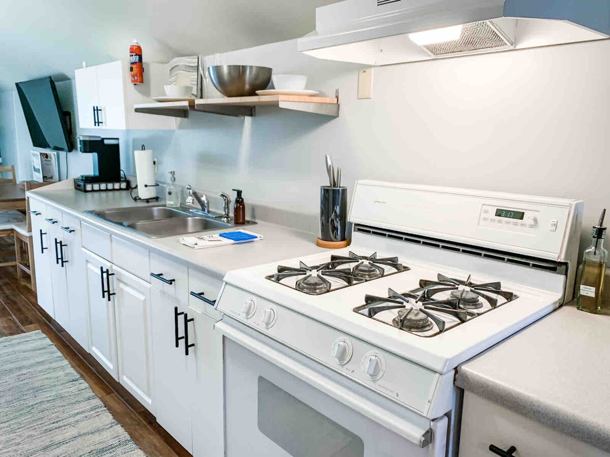 The Tiny House is completely furnished with comfortable leather furniture and tile floors thru out the home. It has a gas, free standing heater for winter warmth. The bed room has a comfortable queen sized bed, closet and dresser. A new leather sofa sleeper has been added to accommodate several more guest. It has a full size memory foam mattress. Parking is right out the front door and a private yard. Guest are surprised that it isn't really that tiny after all-650 sqft.