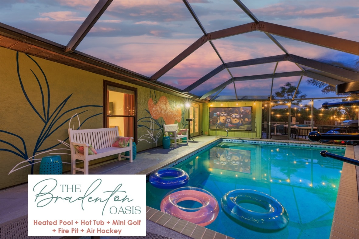 ¡Bienvenido a The Bradenton Oasis! Ya sea que estés chapoteando en la piscina privada, relajándote en la bañera de hidromasaje, disfrutando de la fogata o jugando al minigolf, esta casa familiar tiene algo para todos. • A solo 5,5 millas de la playa • Piscina (climatizada disponible) + bañera de hidromasaje • Pantalla de cine al aire libre • Terraza + mesa/sillas de exterior + parrilla • Minigolf. - Juegos de patio • Lugar para hacer fogata • 5 televisores inteligentes • Hockey de aire en interiores • Equipo de playa. • Servicios para bebés • Espacio de trabajo exclusivo • Internet de alta velocidad de fibra Gigabit • Cargador para vehículos eléctricos