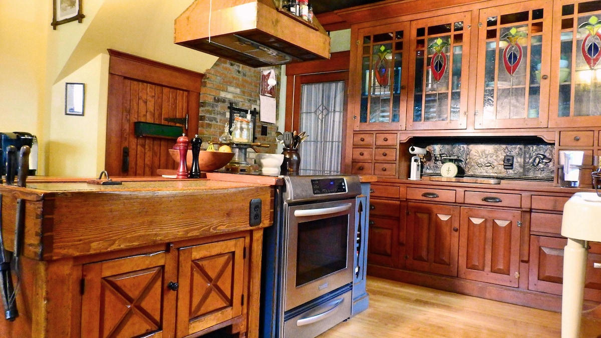 Bienvenido a la casa Craftsman. Retrocede en el tiempo y escapa a este refugio artesanal de 1912 completamente restaurado (una joya del patrimonio canadiense) amueblado con antigüedades. Acurrúcate en nuestra gran habitación con chimenea. Disfruta de la tranquilidad en una bañera con patas. Disfruta de un café o té en el solárium. Disfruta de lo mejor de las actividades al aire libre de verano e invierno desde nuestra puerta en parques prístinos. Los S'mores te esperan mientras te acercas a la chimenea en el patio aislado. Comida gourmet a solo 5 minutos a pie de la ciudad.