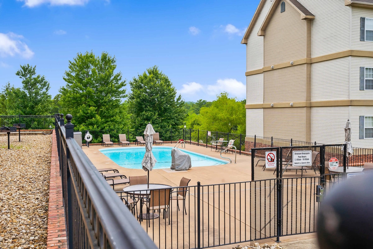 Este apartamento vacacional de Branson se encuentra en un complejo tranquilo en medio de más de 300 acres de montañas Ozark boscosas. ¡Disfrutarás de un apartamento que tiene una gran luz y hermosas vistas a las montañas Ozark! Nuestra cama tamaño queen tiene una cómoda cubierta de espuma de 4 pulgadas para brindarte la comodidad adicional de una gran noche de sueño fuera de casa. Hay un sofá muy cómodo (con un dormitorio tamaño queen) y un televisor grande en la sala de estar para que puedas relajarte después de un día divertido en el lago o en Branson.