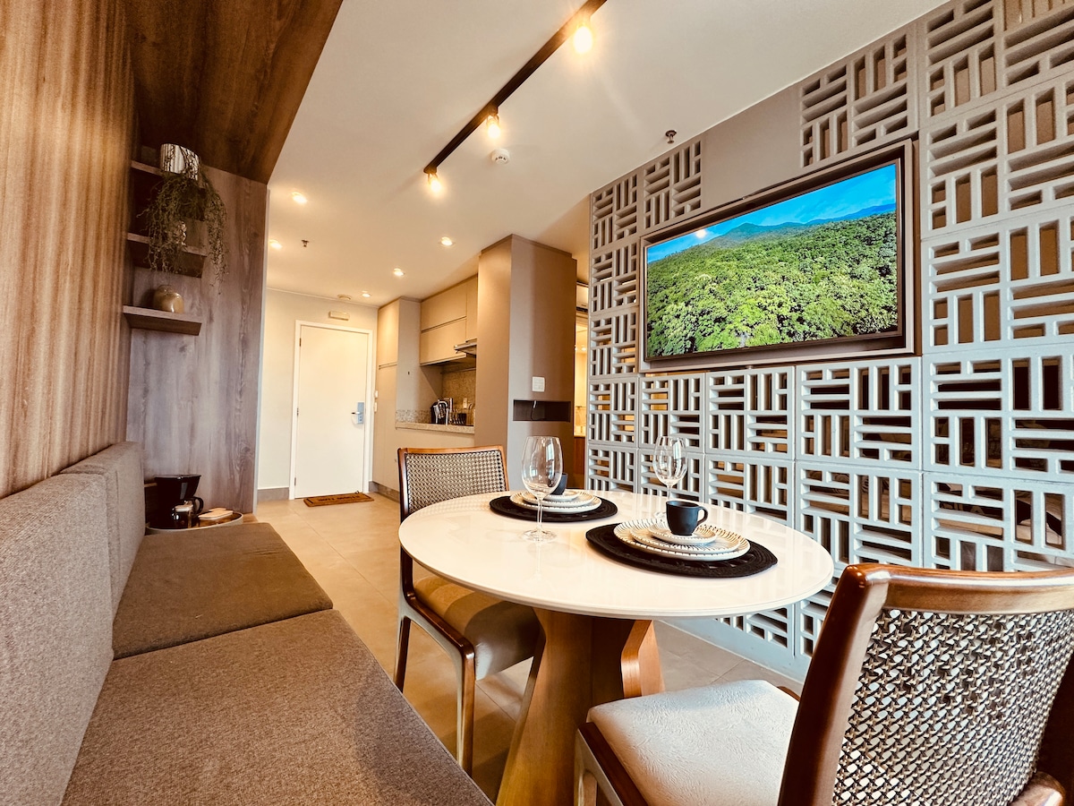 En el hotel Cullinan Hplus Premium. Muy nuevo y contemporáneo. ¡Ubicación increíble! Dos centros comerciales al otro lado de la calle. Excelentes lugares turísticos para ir a pie. Unidad encantadora, finamente decorada y amueblada. En el piso más alto, con una hermosa vista de Brasilia y Asa Norte. Suite de lujo de 29m ² con cama tamaño king. Bien equipado con varios artículos para su comodidad. Aislamiento acústico en las ventanas para un gran descanso. Smart TV. Garaje. Piscina, gimnasio, sauna y restaurante. Llegada las 24 horas en la recepción.