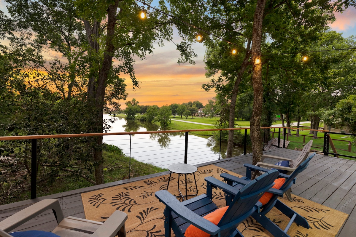 Relájate en tu terraza por la noche sumergiéndote en la belleza de la puesta de sol sobre el lago y maravíllate con las luces solares "luciérnagas" en el árbol que ilumina tu santuario privado en la naturaleza. Relájate en las hamacas privadas de árboles colgantes o diviértete en el agua y alquila KAYAKS, tablas de paddle o canoa en el lugar. ¿Rejuvenece con una sesión privada de yoga, entrenamiento personal o masaje? ¡Estamos a 4 minutos a pie de la bodega Stonehouse Vineyard y justo al final de la calle del pozo de natación alimentado por manantiales de Krause Springs!