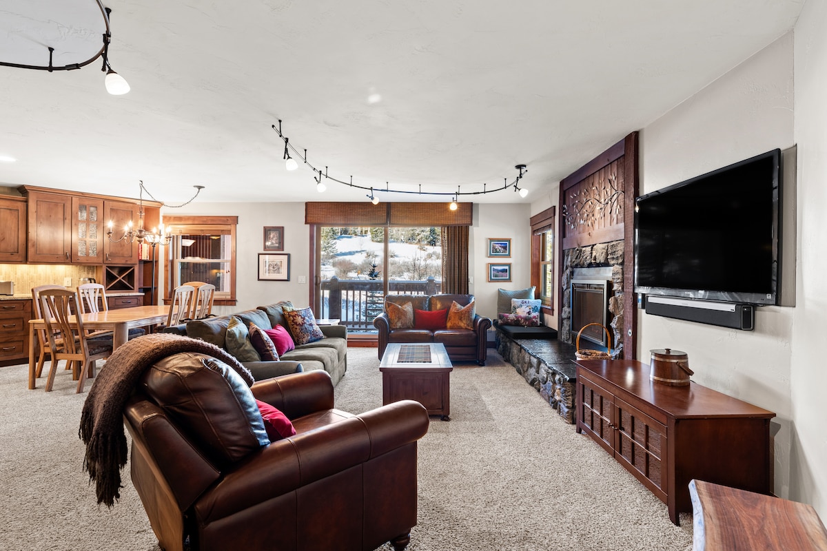 Estudio de lujo actualizado, ¡justo en Four O'clock Run! A 200 pasos del telesilla SnowFlake, esquía por 4 O'clock Run, a 3 manzanas de la histórica Main Street, a poca distancia a pie de rutas de senderismo y terreno para bicicletas de montaña. Este apartamento totalmente renovado incluye una lujosa cama tamaño queen reclinable Ergomotion de Serta, un baño luminoso con muebles modernos y calefacción por suelo radiante, una cocina totalmente equipada y una sala de estar abierta con una mesa de comedor para dos, sofá, chimenea eléctrica y TV inteligente.