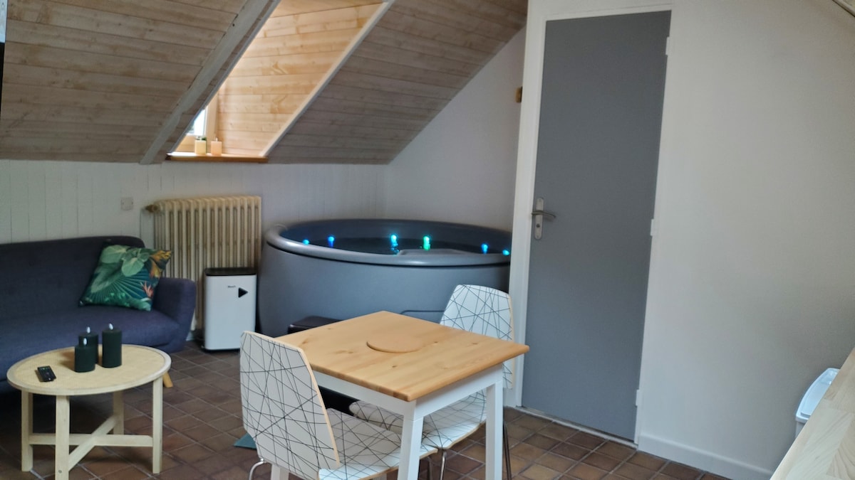 La Grange Romantique dispone de equipamientos de alta gama para ofrecerle un momento de relajación, complicidad y bienestar. Encontrará un spa de relajación, una sauna tradicional y una red para disfrutar de un momento de ingravidez. (acceso privado) Habiendo conservado la estructura original del granero, la altura del techo para la parte de la noche no supera 1,82 m en el centro de la habitación, por lo que conservamos el encanto de este edificio.