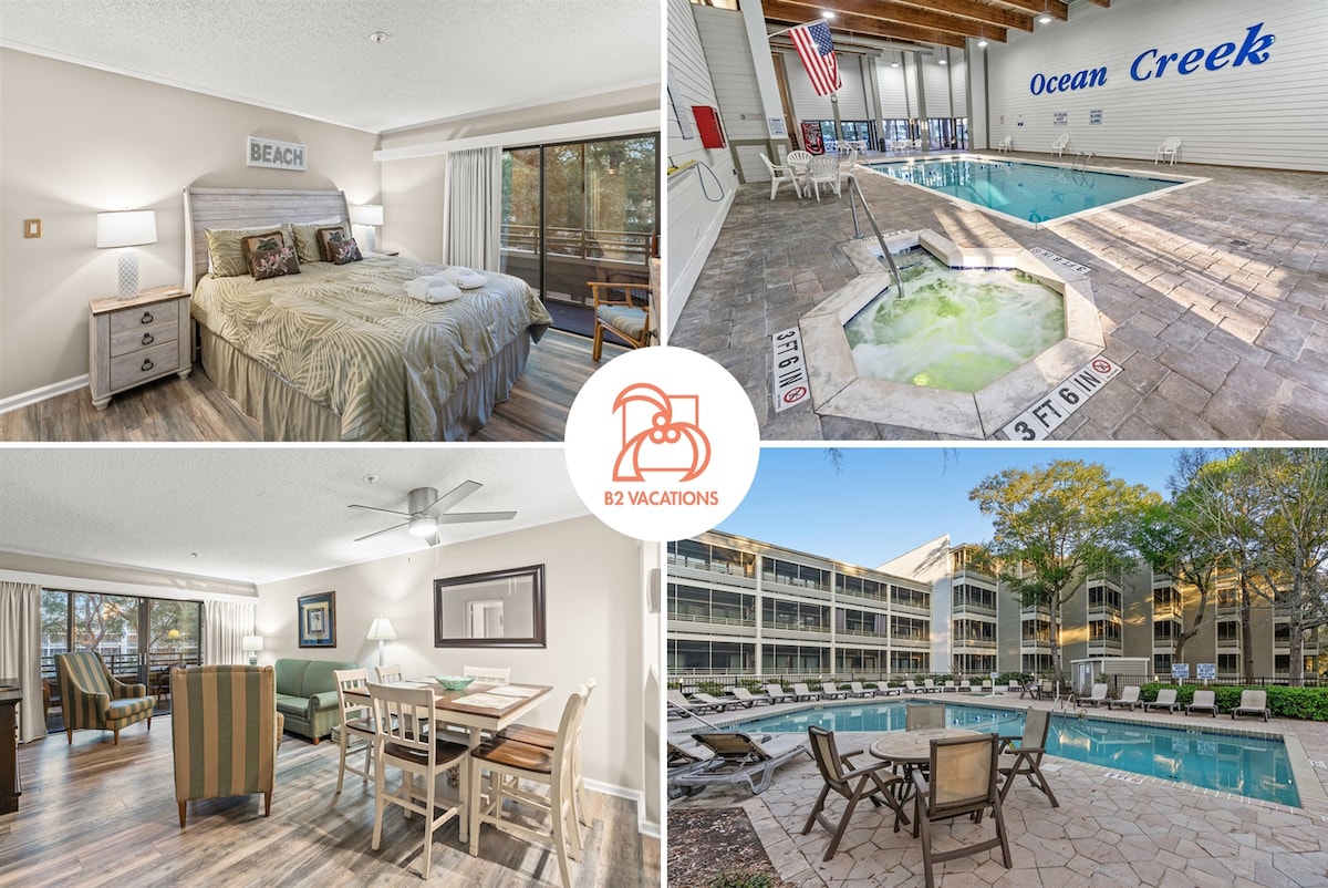 Apartamento remodelado a unos pasos de la playa. Nueva cama tamaño king, persianas oscuras, muebles nuevos, televisores inteligentes, cama queen con colchón de espuma viscoelástica y mucho más. La cocina actualizada lo tiene todo, incluida una Keurig. Alojamiento 1, planta superior, balcón privado, ascensor y wifi de alta velocidad. Ocean Creek cuenta con piscinas cubiertas y al aire libre y jacuzzis, bar de playa, restaurante/salón, tenis, centro de conferencias y una hermosa playa. Al otro lado de la calle se encuentra Barefoot Landing, cerca de todos los principales lugares de interés y restaurantes.