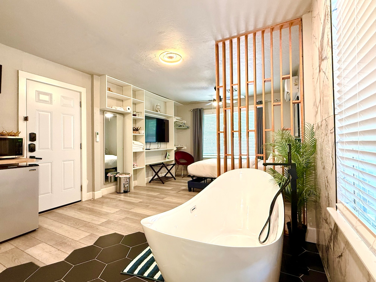 Servicios principales: Sillón 💆 de masaje; Cama 👑 tamaño king con colchón de espuma viscoelástica para dormir cómodamente; Estación de carga de⚡️ vehículos eléctricos disponible con coste adicional (no incluido en la reserva). 🚙 Alquila un Tesla Model Y y disfruta de carga gratuita (desde 60 $/día, mínimo 3 días). Alquileres más cortos disponibles. 📺 Dos televisores de alta definición de 55" en el dormitorio y la sala de estar para su entretenimiento; 🧑🍳Cocina totalmente equipada con elementos esenciales para tus necesidades culinarias; 🚶♂️A poca distancia a pie del Distrito de las Artes Paseo; Y mucho más...