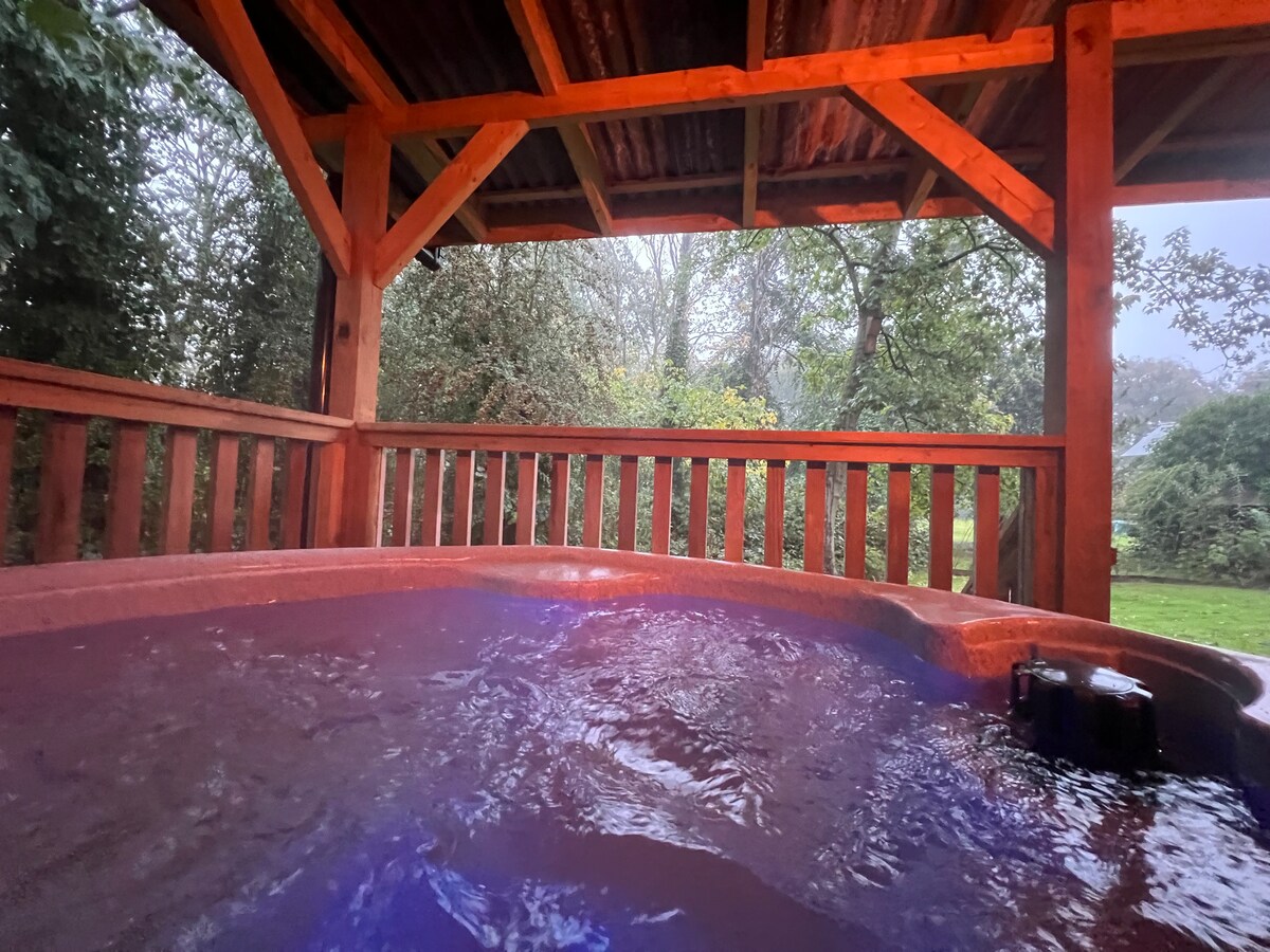 Relájate en esta espaciosa cabaña de un dormitorio con jacuzzi de leña (se aplica una tarifa adicional)en un espacio privado vallado justo al lado de la cabaña. Anfitrión de mensajes por el precio de la bañera. Dentro de la cabaña hay TV lounge, wifi y cocina americana con sofá cama doble para huéspedes adicionales. Hay 1 dormitorio separado con cama doble (ropa de cama y toallas suministradas a costo adicional), colchón,sábana y 2 enchufes. La cocina pequeña tiene microondas, nevera con congelador, hervidor de agua, tazas, copas de vino, platos, tazones, cocina y pequeña barra de desayuno con 2 taburetes de bomba.