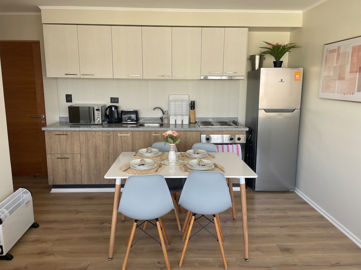 Moderno Dpto NUEVO full equipado, ideal para viajes familiares o de trabajo. Decoración acogedora que harán que tu estadía sea lo más confortable y segura posible, Ubicado en un barrio tranquilo y con un entorno rodeado de mucha naturaleza. Cuenta con conserjería 24 hrs, ascensor en el edificio, viene incluido estacionamiento gratis a pasos de la entrada principal. Con una ubicación privilegiada a pasos de Casino Marina del Sol, del Aeropuerto Carriel Sur, Mall trébol etc. A 2, 30 de las termas