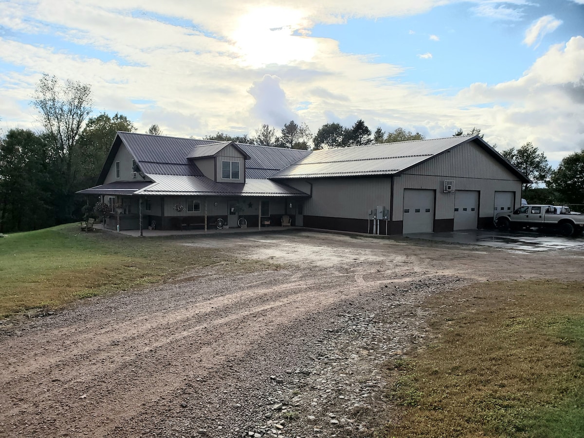 Aire fresco del campo. Hermosas vistas. Televisión por cable, wifi. Jacuzzi (sin productos químicos). Amplia cocina amueblada. Sofá seccional con sillones reclinables. Sillón reclinable. Chimenea eléctrica. Fogata al aire libre (trae tu propia madera). Lavadora y secadora. 12 pulgadas de altura en la bañera/ducha. Esta hermosa escapada está unida a la tienda del negocio familiar. Cargamos remolques de vez en cuando y trabajaremos en la tienda a veces. Ruido mínimo. A 30 minutos de Eau Claire. Estamos a solo 25 minutos de dos lagos con playas.