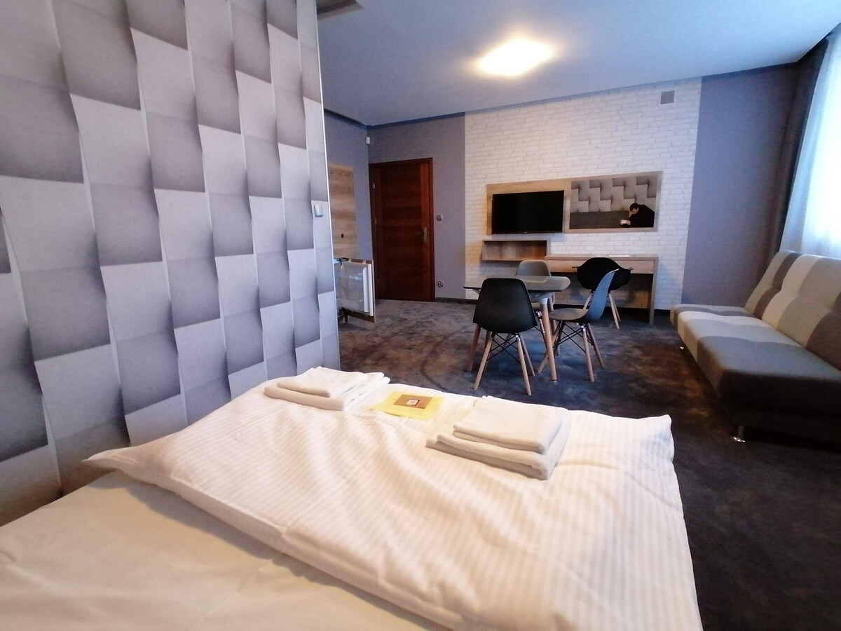 Elegancko urządzony apartament dla dwóch lub trzech osób o podwyższonym standardzie. W apartamencie znajduje się pokój z wygodnym, dwuosobowym łóżkiem, kanapa, biurko, tv, w pełni wyposażona kuchnia a także nowoczesna łazienka z prysznicem. Apartament mieści się na parterze, posiada osobne wejście. Istnieje możliwość wynajęcia dodatkowej sypialni z łazienką za dodatkową opłatą. Blisko lokalizacji mieści się jezioro Niskie Brodno, liczne lasy, a także centrum miasta i okoliczne sklepy.