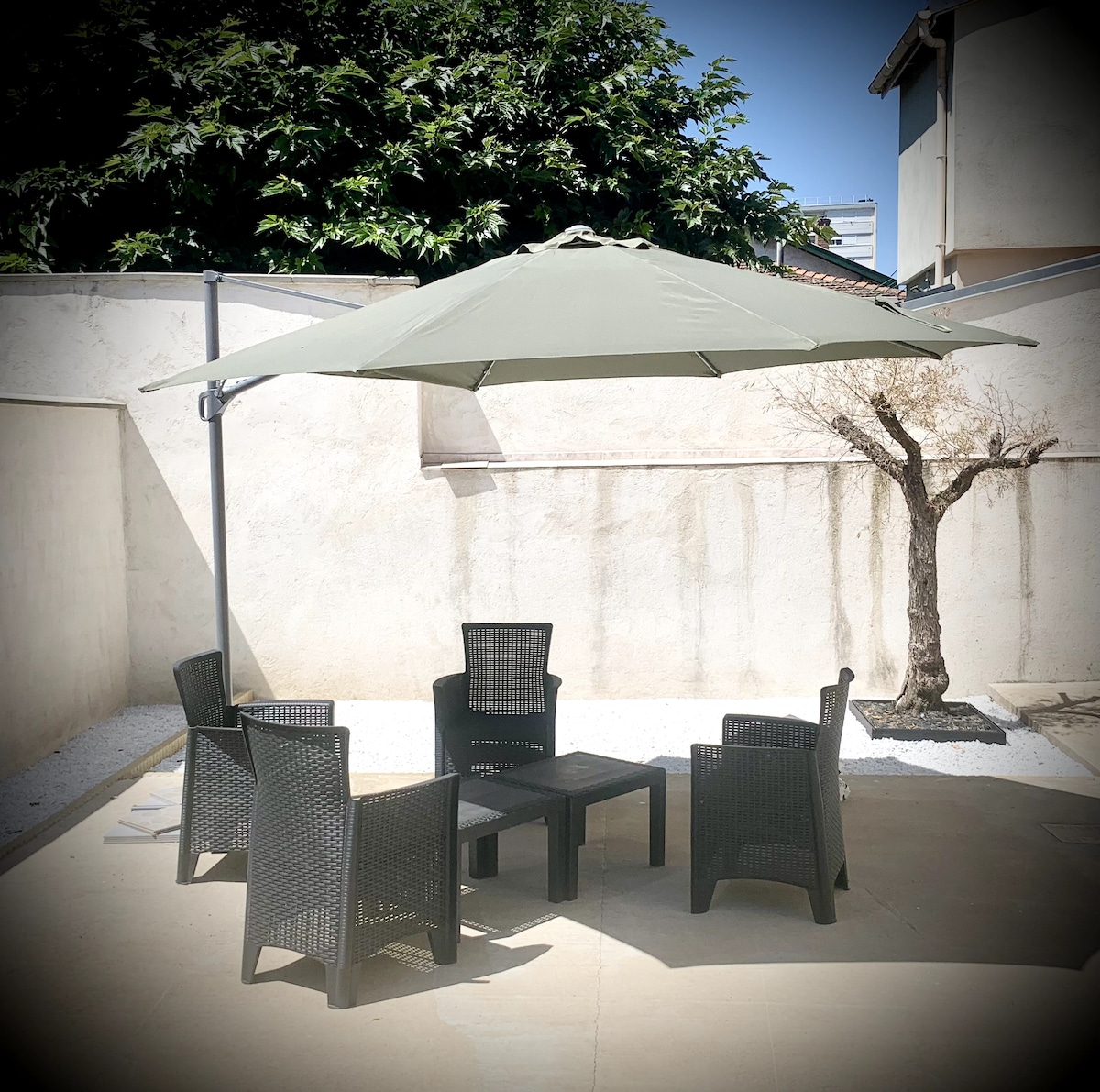 Estudio de lujo con terraza independiente en una zona residencial cerca de todos los servicios y medios de transporte, cerca de un gran centro comercial. El estudio se encuentra a 5 minutos de la entrada de Lyon y a 5 minutos de Eurexpo. Un pequeño nido acogedor con todas las comodidades. Servicios cuidados y decoración de moda: aire acondicionado, cocina equipada, ducha a ras de suelo, inodoro suspendido, secador de toallas, secador de pelo, cafetera, zona de TV/TNT, wifi gratuito, plancha... Plaza de aparcamiento gratuita en el sitio (libre en la calle)