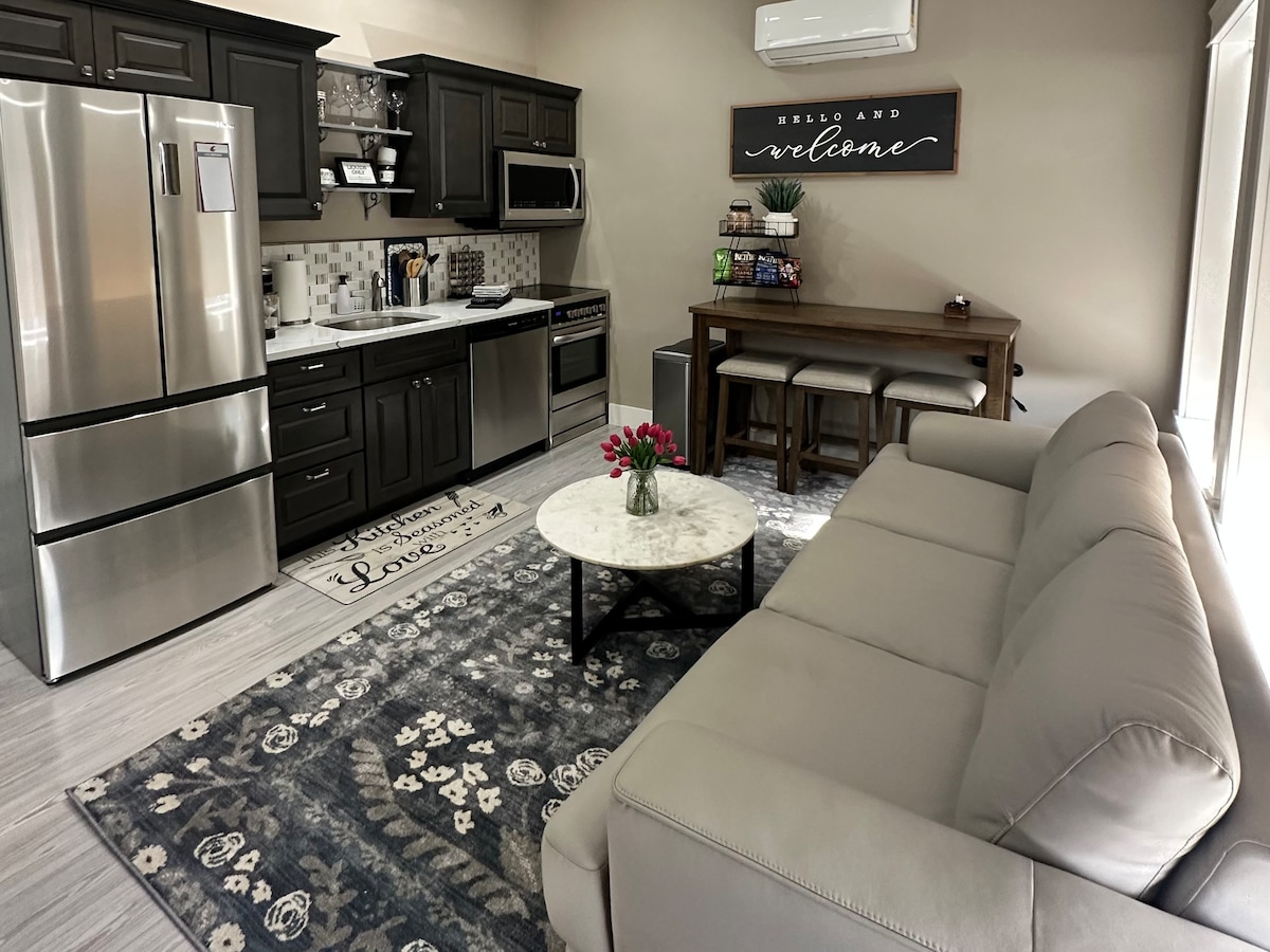 Relax in this calm, clean and simple space. Enter in from the sidewalk fence to a little patio great for enjoying your coffee and some fresh air. There is a full kitchen that opens into the living area with a skylight and high windows that offer great natural light. Walk down the hall and enjoy the spacious bathroom with our provided bath tray for real relaxation. Tuck yourself into bed and enjoy the stars or choose to black out windows using our automated shades for uninterrupted sleep.