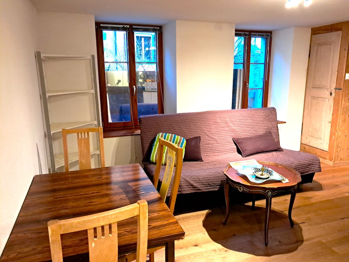 Apartamento de dos habitaciones en la planta baja, a solo 2 minutos a pie del lago Murten y a otros 2 minutos a pie del río Broye. Como la unidad está parcialmente por debajo del nivel del suelo, recibe un poco menos de luz natural, lo que mantiene la temperatura agradablemente fresca en verano. La cocina está equipada con procesadores de alimentos y todos los utensilios básicos. Hay lavadora y secadora de ropa. Accede a través de 10 pasos. Los niños y los perros son bienvenidos. El ruido no es un problema, y el apartamento está bien aislado.