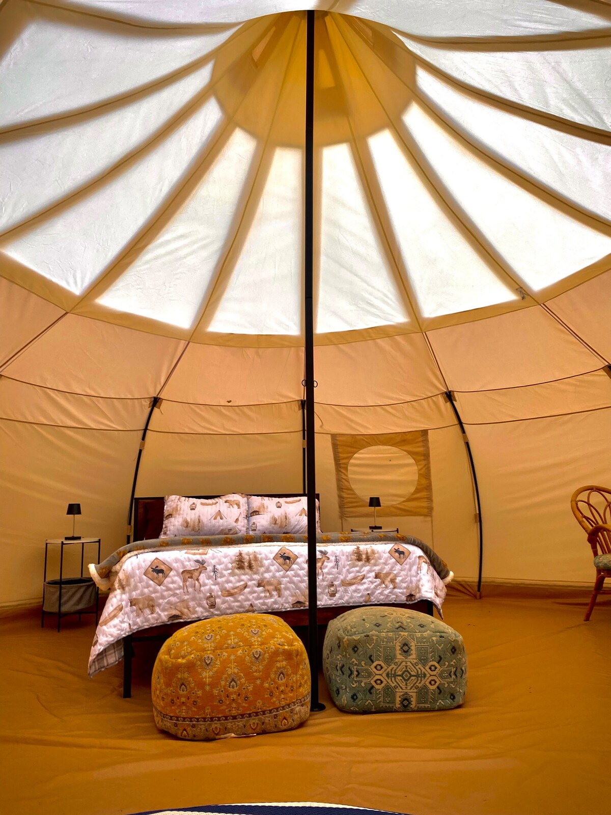 Nuestra tienda es un refugio familiar que combina el encanto rústico con las comodidades modernas. Tiene capacidad para seis personas con dos camas dobles y una cama tamaño queen. Disfruta de una fogata al aire libre, una barbacoa de carbón, sillas al aire libre y una toma de corriente. En la propiedad, encontrarás un parque infantil, un campo de fútbol, una cancha de voleibol, un juego de pelota con cuerda y un juego de lanzar herraduras. Puedes visitar cabras y caballos, explorar el estanque de ranas y alimentar a las tortugas mordedoras. Los fines de semana, hay una heladería y una tienda de velas de campo abiertas. Duchas y aseos públicos