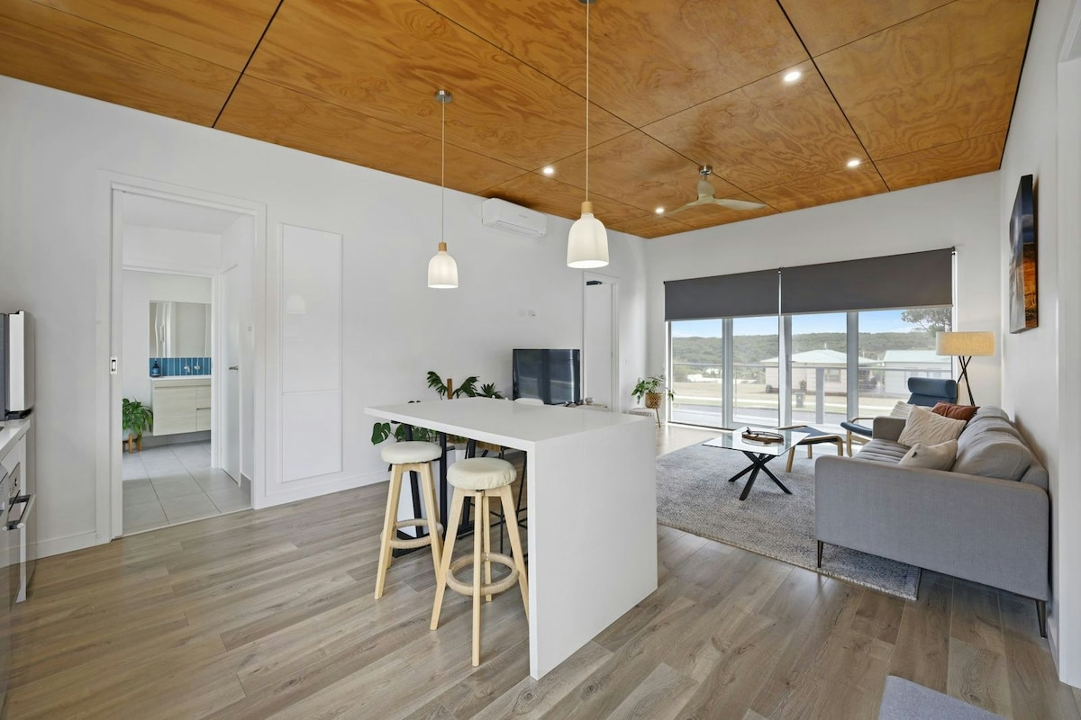 Rodeado de vegetación nativa y a 5 minutos de la playa, Blue Studio es un oasis en la Great Ocean Road. Esta casa contenedor de 144 metros cuadrados, 2 dormitorios, diseñada por un arquitecto, tiene una amplia terraza con vistas al jardín, pájaros, vida silvestre y llanuras onduladas. Esta acogedora casa se encuentra en una tranquila carretera sin salida, que termina en la cima del acantilado con vistas al océano Austral. La playa trasera ofrece unas vistas espectaculares del parque costero de la bahía de las Islas. Las playas emblemáticas están a 10 minutos en coche.