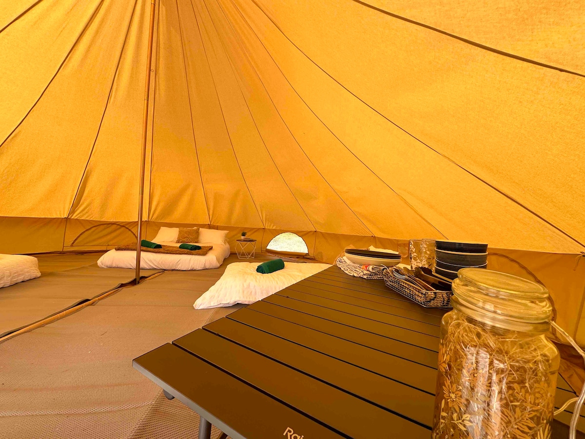 Hermosa tienda de campaña, situada en un prado de 4 acres junto al bosque con vistas al campo, barbacoa Webber, chimenea y hamaca. Con un inodoro con cisterna compartido al aire libre y una ducha caliente. El área de la bañera de hidromasaje solo se puede reservar entre las 9:00 a. m. y las 10:00 p. m. cada día. A solo 8 minutos a pie del Village Chackmore, a 20 minutos de los jardines Stowe y a 30 minutos de Buckingham. Te recomendamos que traigas: linterna y manta adicional para la noche. ESTUFAS DE FUEGO RETIRADAS EN MAYO