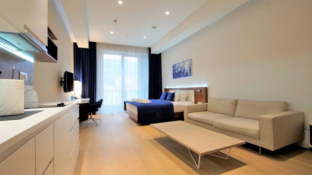Nuevo apartamento de un dormitorio en un edificio nuevo en el corazón de Budva. Centro comercial TQ Plaza y mercado central a 2 minutos a pie, casco antiguo a 5 minutos, playa, restaurantes, bares, tiendas, estación de autobuses a poca distancia a pie. Todo está a una distancia de 2 a 5 minutos a pie. El apartamento está totalmente equipado para una estancia cómoda: (cocina completa con horno, baño espacioso, TV por cable, internet de alta velocidad, lavadora, dos aires acondicionados), terraza amueblada con vistas a la ciudad y a la montaña. Disponibilidad de plazas de aparcamiento.